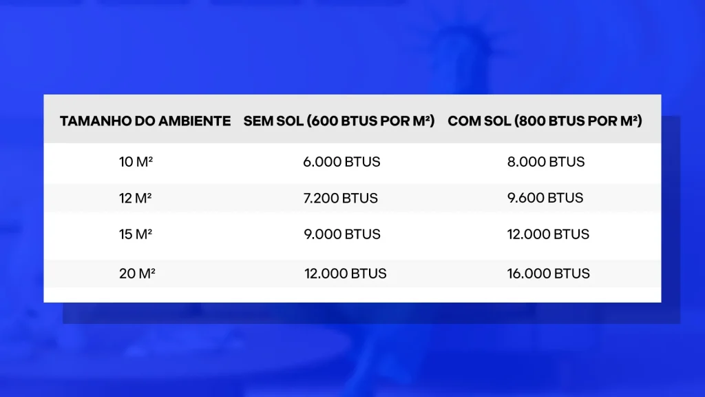 Já em ambientes com incidência de luz solar, o cálculo deve ser feito com 800 BTUs por metro quadrado.