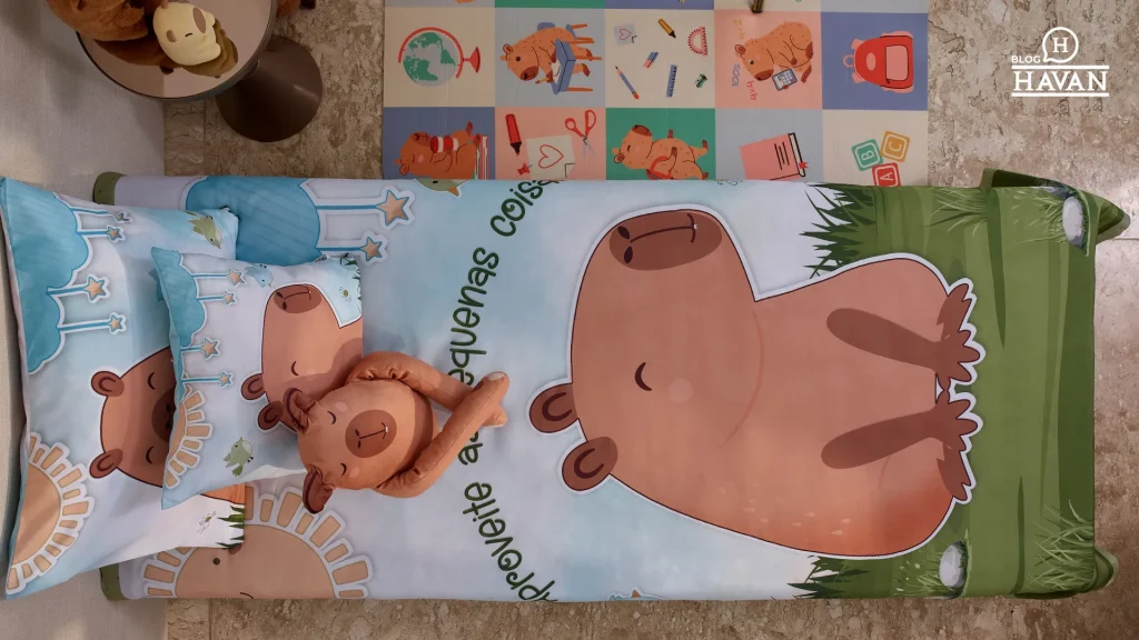 Na decoração, a capivara ganhou espaço em almofadas, mantas, lençóis, tapetes e até quadros. E é fácil entender por quê: ela combina com ambientes aconchegantes e modernos, trazendo aquela sensação de “casa feliz”.
