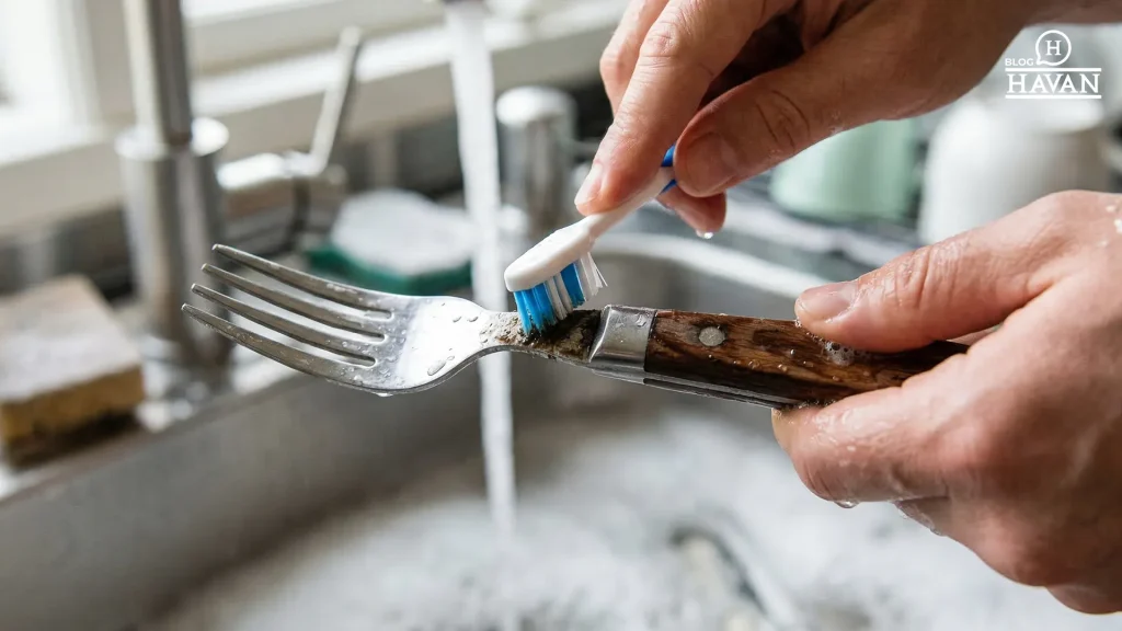 Se estiver muito sujo, deixe o talher alguns minutos em água morna antes de escovar. Esse cuidado simples melhora muito o resultado final da limpeza.