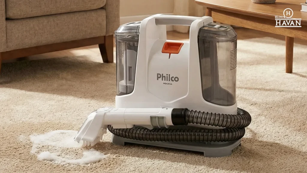 Esse é um modelo portátil, ideal para limpar manchas de café, vinho, xixi de pet e outras sujeiras de estofados, tapetes e carpetes.