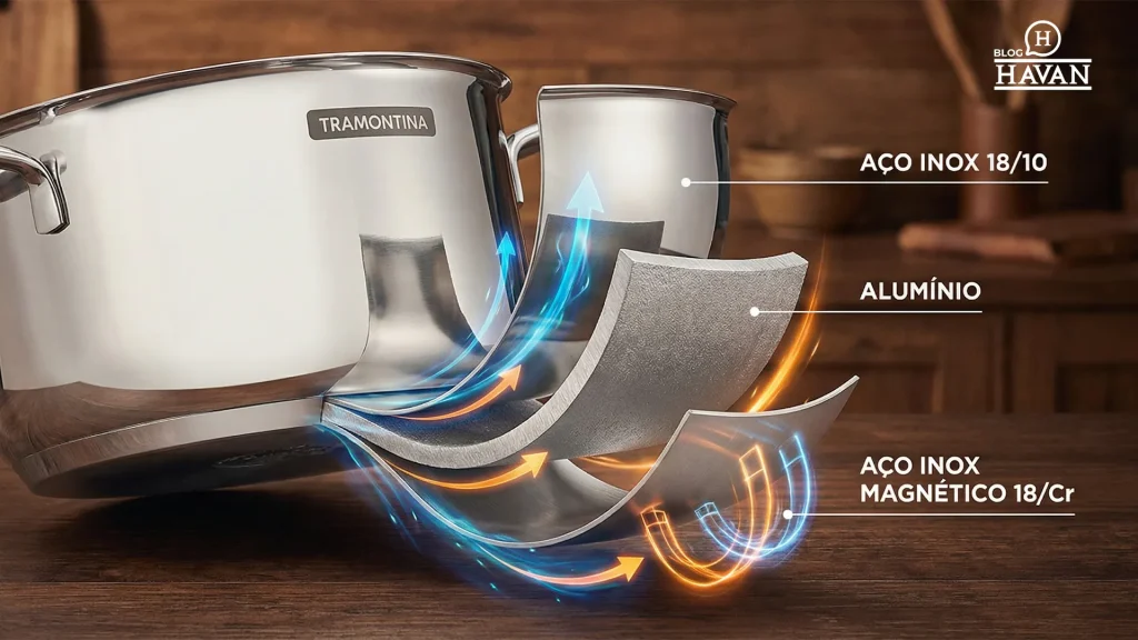 Panelas com fundo triplo ou encapsulado geralmente funcionam em indução porque têm camadas de diferentes metais, incluindo os magnéticos.