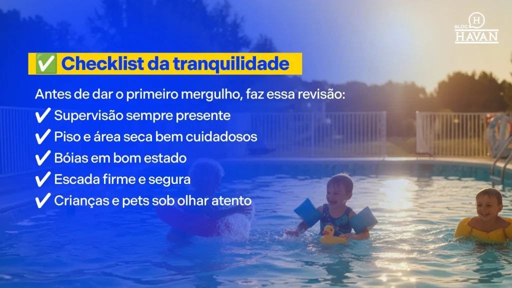 Parece óbvio, mas é sempre bom reforçar: nunca deixe crianças sozinhas perto da piscina. Nem por “só um segundinho”. A supervisão constante é a melhor forma de garantir a segurança de todo mundo.