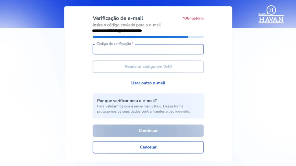 Ao finalizar o cadastro, você receberá um código de verificação no e-mail cadastrado. Copie o código, cole na plataforma e confirme.