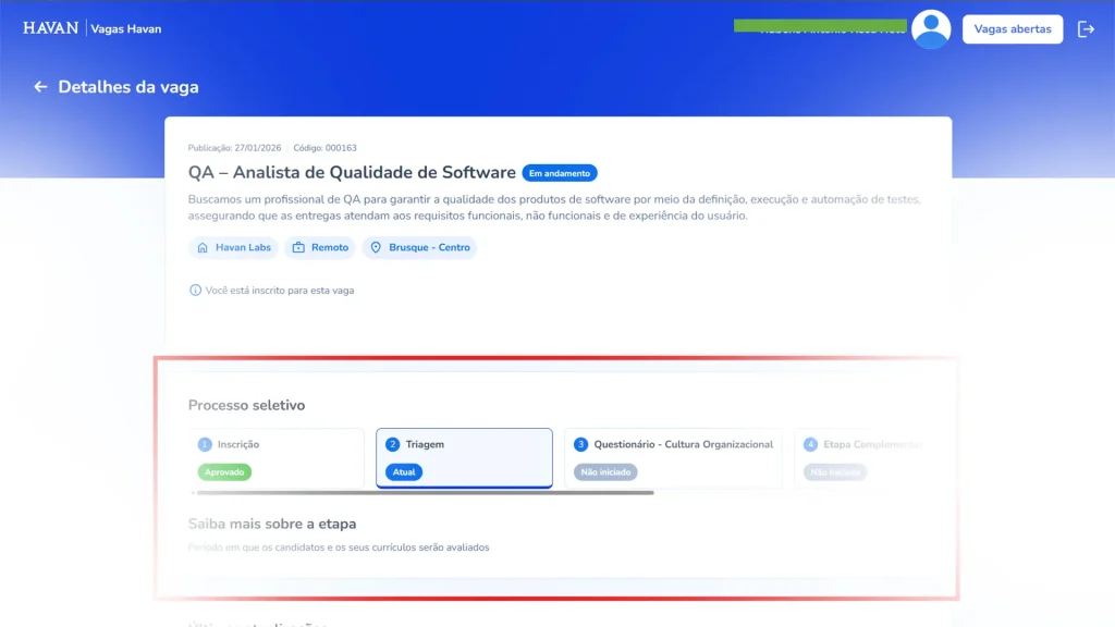 Se você quiser mais informações sobre uma vaga e o andamento do processo de seleção pelo setor de recursos humanos, é só clicar em cima dela em Minhas Inscrições e ver as Etapas do Processo Seletivo: