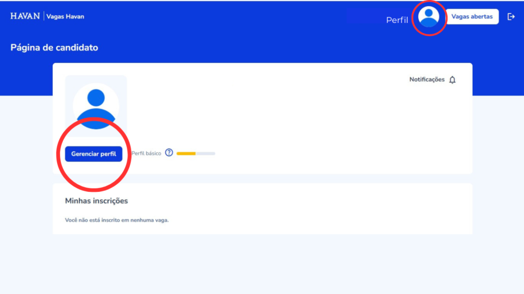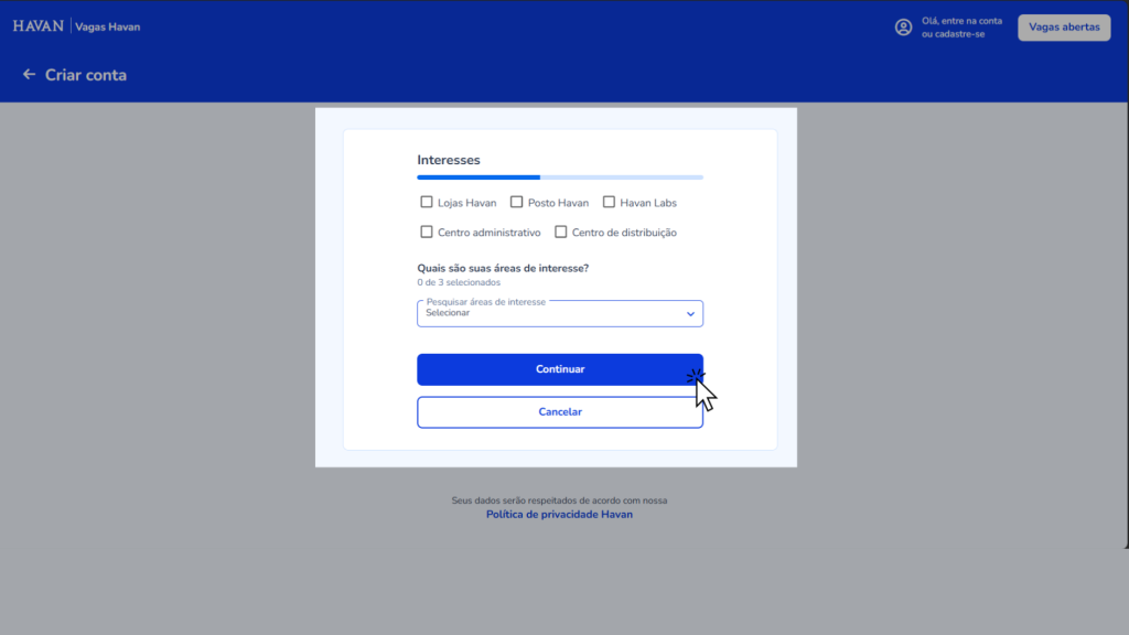Entre no site vagas.havan.com.br e selecione a opção criar sua conta.