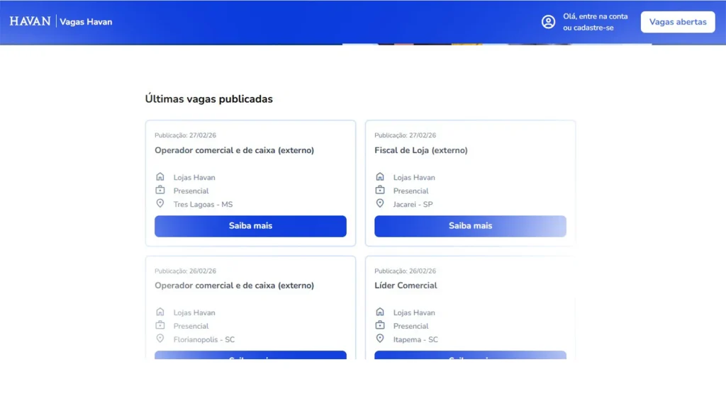 Confira a nova plataforma de vagas da Havan pra você cadastrar seu currículo de forma simples e rápida. Aqui você cria sua conta, se candidata às vagas e consegue ver exatamente em que etapa o processo seletivo está. Vem comigo que eu te explico tudo, passo a passo.